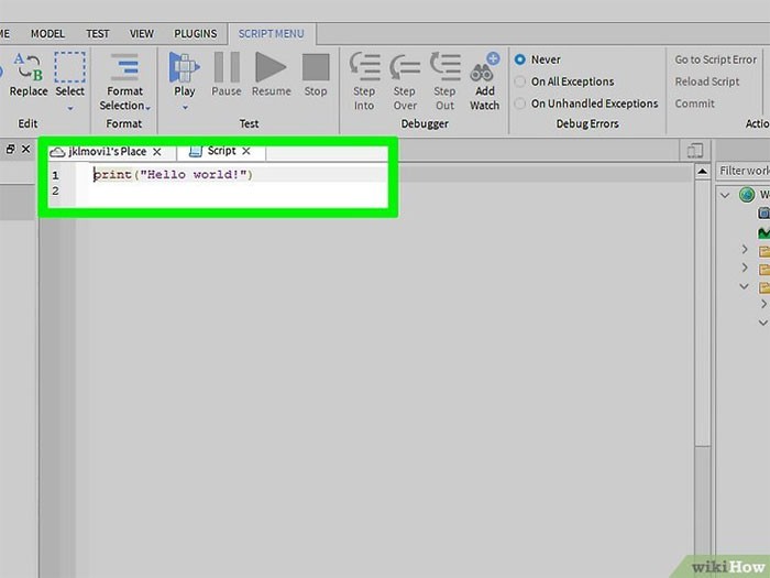 Bước 6: Bắt đầu viết script của bạn. Lưu ý rằng các tập lệnh trong Roblox được viết bằng ngôn ngữ Lua, do đó, người dùng cần phải có kiến thức cơ bản về lập trình và viết mã.
