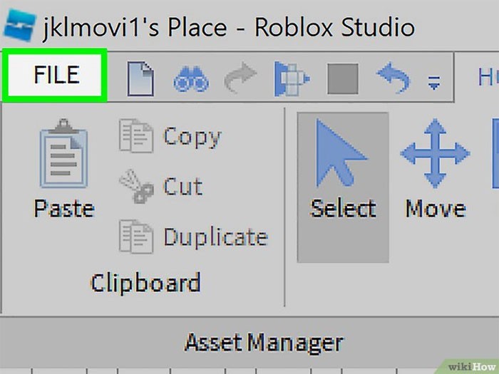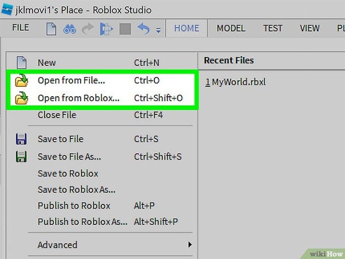 Nhấp vào File, sau đó chọn Open from File hoặc Open from Roblox. Tiếp theo, chọn trò chơi hoặc tệp Roblox (.rbxl) mong muốn và nhấn Open.