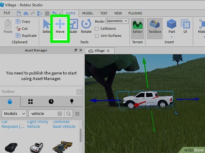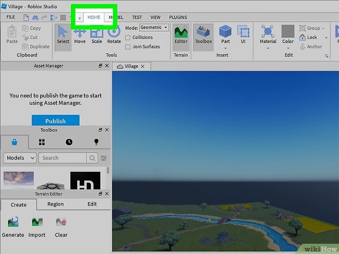 Nếu các công cụ Select, Move, Scale, hoặc Rotate không hiển thị trong bảng điều khiển phía trên, hãy chọn tab Home hoặc Model ở đầu màn hình.