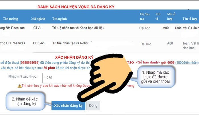 Mã OTP (One-Time Password) sẽ được gửi đến số điện thoại mà thí sinh đã đăng ký. Sau đó, thí sinh nhập mã này vào ô Nhập mã xác thực và chọn Xác nhận đăng ký để hoàn tất việc thay đổi thứ tự nguyện vọng xét tuyển Đại học 2023.