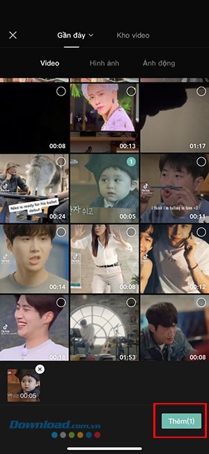 Bước 2: Chọn các hình ảnh và video mà bạn muốn đưa vào dự án của mình. Sau đó, nhấn vào nút Thêm nằm ở góc dưới bên phải màn hình.