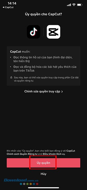 Bước 3: Để CapCut có thể truy cập và sử dụng tài khoản TikTok của bạn, hãy nhấn Ủy quyền.