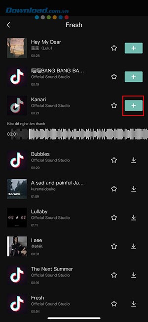 Bước 5: Nhấn vào bất kỳ bài hát nào để phát thử và nghe trước. Sau khi đã quyết định, bài hát sẽ được tải xuống. Cuối cùng, chọn dấu cộng màu xanh bên cạnh tên bài hát để thêm nó vào khu vực chỉnh sửa video.