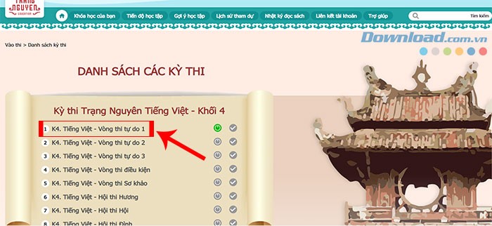 Bước 2: Trong giao diện hiện ra, nhấn chọn một bài thi có sẵn, ví dụ như K4. Tiếng Việt - Vòng thi tự do 1 (biểu tượng kích hoạt có màu xanh lá cây).