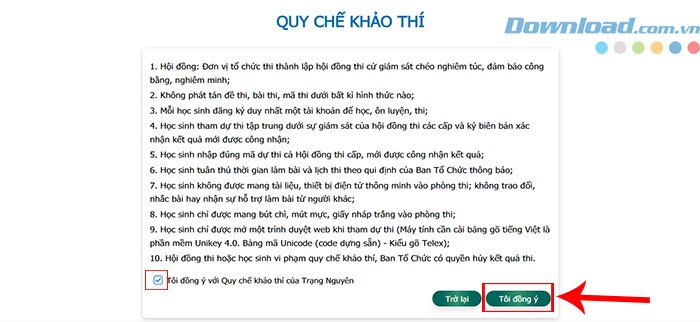 Bước 3: Đọc kỹ toàn bộ Quy chế khảo thí để hiểu rõ các quy định của cuộc thi. Tiếp theo, đánh dấu vào ô Tôi đồng ý với Quy chế Khảo thí và nhấn nút Tôi đồng ý.