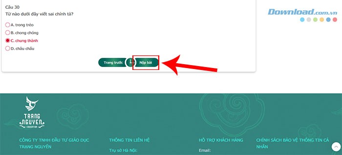 Bước 5: Sau khi hoàn tất bài thi, nhấn nút Nộp bài ở cuối trang hoặc tại khu vực hiển thị Số câu hỏi đã trả lời.