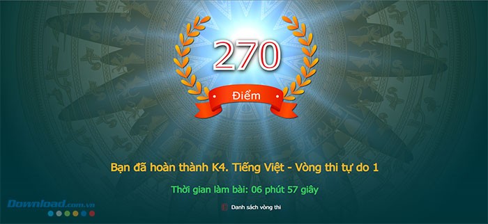 Bước 7: Một thông báo xác nhận hoàn thành kỳ thi, kèm theo số điểm đạt được và thời gian làm bài sẽ được hiển thị. Đến đây, học sinh đã hoàn thành vòng thi tự do của Trạng Nguyên Tiếng Việt 2023-2024.