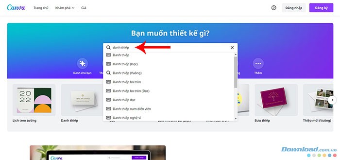 - Ngoài ra, bạn có thể nhập từ khóa Danh thiếp vào thanh tìm kiếm và lựa chọn một trong các tùy chọn danh thiếp mà Canva đề xuất.
