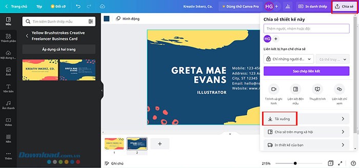 Khi bạn đã hoàn toàn hài lòng với thiết kế danh thiếp của mình, hãy nhấp vào biểu tượng mũi tên ở góc trên bên phải để tải xuống.