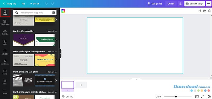 Trong khu vực bên trái màn hình, thông qua tab Mẫu, người dùng có thể dễ dàng tìm kiếm các mẫu thiết kế hoặc duyệt qua các danh mục được Canva phân loại sẵn, chẳng hạn như Danh thiếp âm nhạc, Danh thiếp dịch vụ ăn uống, Danh thiếp giáo viên,...