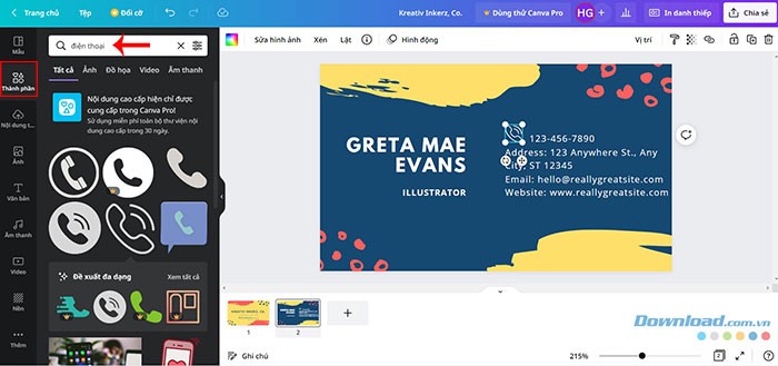Nếu mẫu bạn đã chọn còn thiếu các yếu tố cần thiết hoặc bạn muốn thêm bất kỳ nội dung nào khác vào danh thiếp (ví dụ: biểu tượng điện thoại, địa chỉ email, liên kết mạng xã hội,...), hãy nhấp vào tab Thành phần ở phía bên trái. Tại đây, bạn sẽ tìm thấy nhiều lựa chọn khác nhau như Hình dạng, Đường nét, Hình ảnh, Đồ họa,... để làm phong phú thêm cho thiết kế của mình.