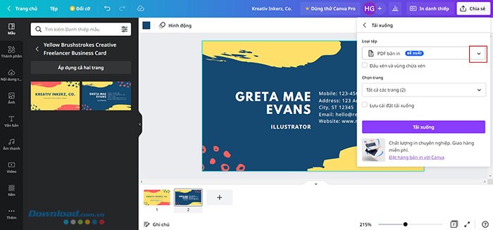 Canva sẽ tự động đề xuất tải xuống danh thiếp dưới dạng tệp PDF để in, tuy nhiên bạn có thể thay đổi định dạng tệp bằng cách nhấp vào menu thả xuống trong mục Loại tệp.