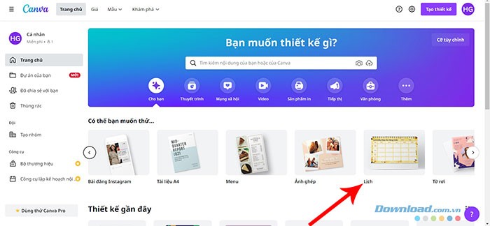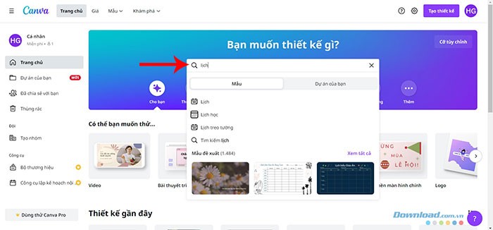 - Trên giao diện chính của Canva, tại banner tìm kiếm lớn màu xanh với dòng chữ Bạn muốn thiết kế gì?, hãy nhập từ khóa Lịch vào ô tìm kiếm.