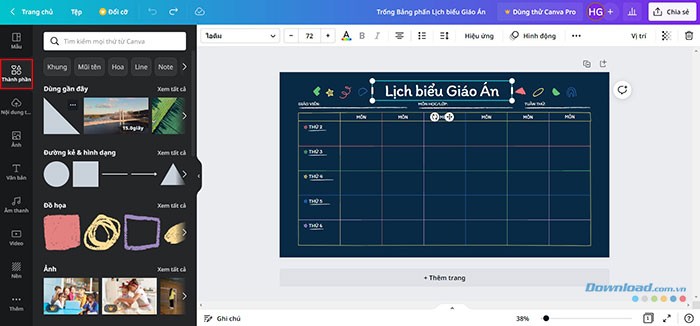 Nếu mẫu bạn đã chọn còn thiếu yếu tố nào đó hoặc bạn muốn thêm bất kỳ nội dung nào khác, hãy nhấn vào tab Thành phần ở phía bên trái. Tại đây, bạn sẽ tìm thấy nhiều tùy chọn như Hình dạng, Đường nét, Hình ảnh, Đồ họa,... để làm phong phú thêm cho thiết kế của mình.