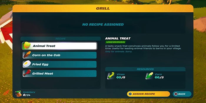 Trong LEGO Fortnite, người chơi có thể tự chế tạo một chiếc Grill bằng cách sử dụng 30 Granite. Khi đã có Grill, game thủ có thể bắt tay vào chế biến Animal Treat bằng cách kết hợp 5 Vine và 3 Corn.