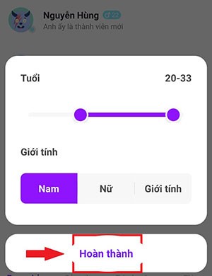Bước tiếp theo là điều chỉnh các thông số về Tuổi và Giới tính của những người bạn mong muốn được kết nối. Việc này giúp Litmatch lọc ra những đối tượng phù hợp nhất với sở thích của bạn. Sau khi đã thiết lập, đừng quên nhấn Hoàn thành để lưu lại các thay đổi.