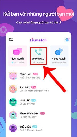 Để bắt đầu, hãy mở ứng dụng Litmatch và chọn Voice Match ngay tại trang chủ. Lưu ý rằng mỗi người dùng chỉ có 8 cơ hội ghép đôi trong một ngày, vì vậy hãy cân nhắc kỹ lưỡng trước khi kết nối với ai đó.