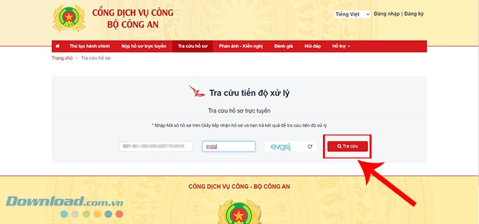 Bước 3: Quay lại trang Tra cứu tiến độ xử lý hồ sơ trực tuyến, dán Số hồ sơ vừa sao chép vào ô Nhập mã hồ sơ. Đồng thời, nhập Mã xác nhận do hệ thống cung cấp. Sau đó, nhấn nút Tra cứu.