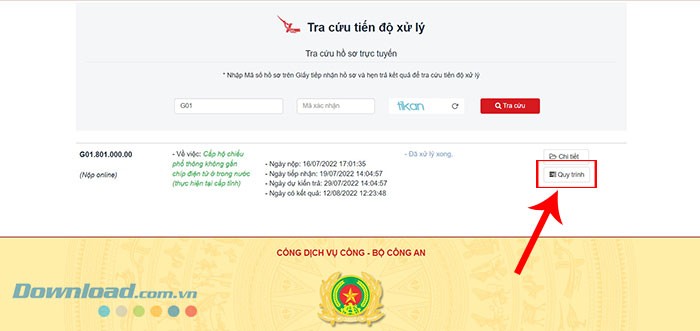 Bước 4: Thông tin cập nhật về tiến độ hồ sơ sẽ được hiển thị ngay bên dưới. Để xem chi tiết các giai đoạn hoàn thành hộ chiếu và thời gian dự kiến nhận hộ chiếu, hãy chọn Quy trình.