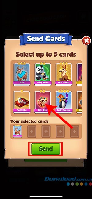 Bước 4: Nhấn vào nút Send, sau đó chọn một người bạn từ danh sách bạn bè trong Coin Master. Cuối cùng, ấn vào nút Select Cards để xác nhận.