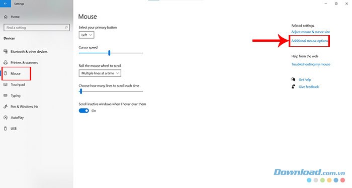 Bước 4: Cuộn xuống dưới và chọn Mouse ở phía bên phải, sau đó nhấn vào Additional mouse settings.