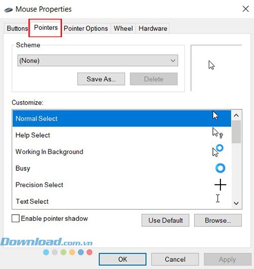 Thay đổi hình dạng con trỏ chuột trong Windows 10