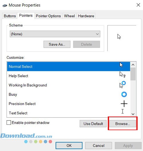 Bước 7: Sau khi đã chọn được con trỏ cần thay đổi, hãy nhấp vào nút Browse. Một cửa sổ quản lý tệp sẽ được mở ra. Nếu bạn đã tải con trỏ về máy, hãy tìm đến thư mục chứa nó. Ngoài ra, bạn cũng có thể sử dụng các con trỏ mặc định được liệt kê sẵn.