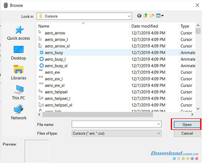 Bước 8: Chọn con trỏ chuột mà bạn muốn sử dụng, sau đó nhấn vào Open.