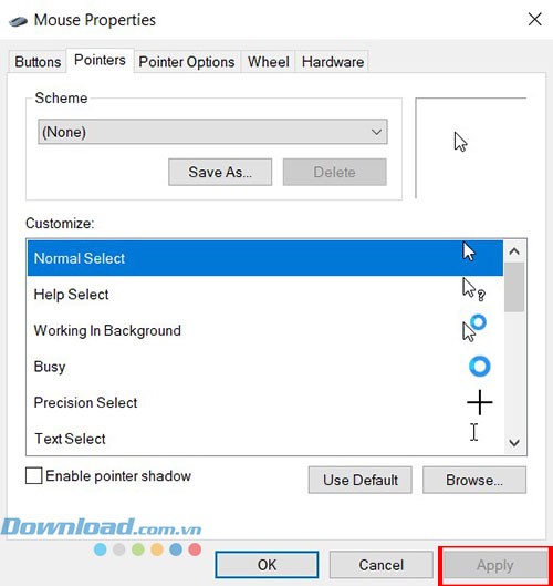 Bước 9: Windows sẽ ngay lập tức thay đổi con trỏ chuột theo lựa chọn của bạn. Sau khi đã tùy chỉnh tất cả các con trỏ theo ý muốn, hãy nhấp vào Apply > OK.