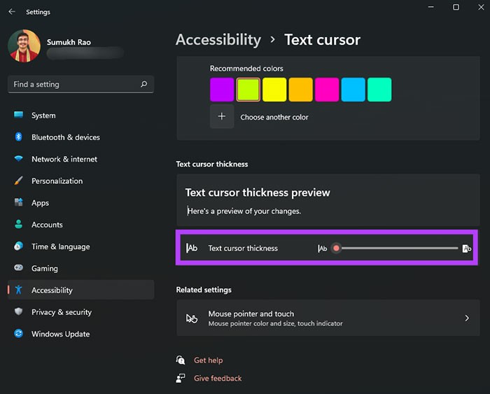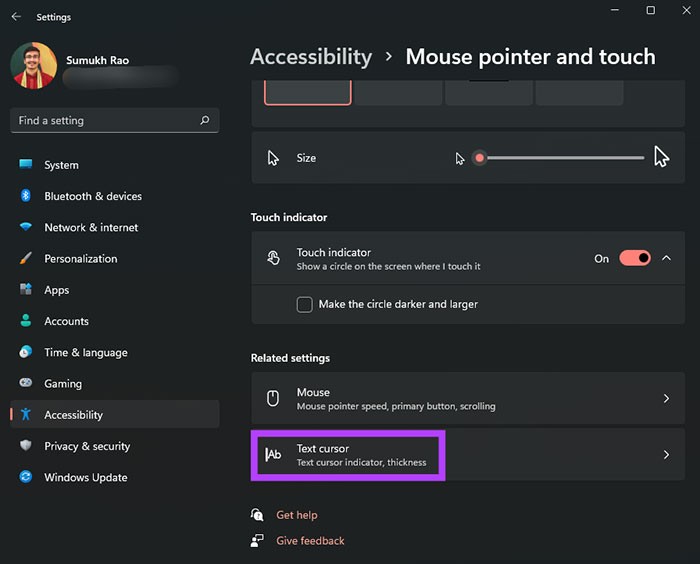 Tại giao diện này, người dùng có thể kích hoạt hoặc vô hiệu hóa tùy chọn Text cursor indicator. Đồng thời, bạn cũng có thể điều chỉnh màu sắc và kích thước của con trỏ văn bản theo sở thích cá nhân.