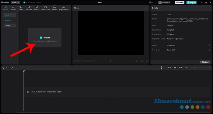 Bước 2: Trong giao diện chính của CapCut PC, hãy nhấp vào Import và chọn video mà bạn muốn loại bỏ phông nền.