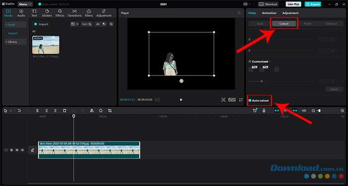 Bước 4: Chọn tab Cutout, nằm ở khu vực phía trên bên phải của giao diện. Tiếp theo, di chuyển xuống dưới và đánh dấu chọn vào tùy chọn Auto cutout. CapCut PC sẽ tự động nhận diện chủ thể và loại bỏ phần nền của video.