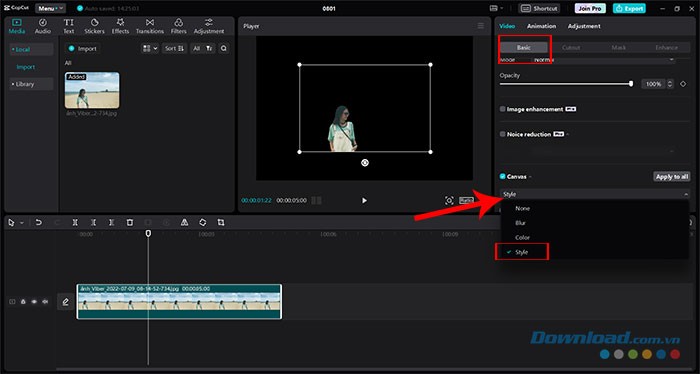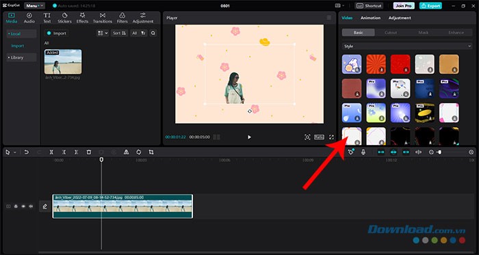 Sau khi đã xóa phông nền gốc, người dùng có thể tùy chỉnh và thêm một phông nền mới cho video bằng cách truy cập vào tab Basic.