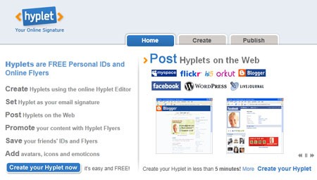 Để bắt đầu, hãy truy cập trang chủ của dịch vụ theo địa chỉ đã cung cấp. Sau đó, nhấp vào liên kết Create your Hyplet now để khởi tạo quá trình tạo chữ ký. Hyplet là một dịch vụ hoàn toàn miễn phí và yêu cầu trình duyệt web của bạn hỗ trợ công nghệ Flash.