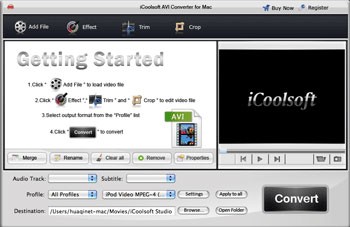 iCoolsoft AVI Converter for Mac được phát triển dành riêng cho cộng đồng người dùng máy Mac, cung cấp khả năng chuyển đổi các tập tin video định dạng AVI sang nhiều định dạng audio và video thông dụng khác. Đồng thời, phần mềm này cũng hỗ trợ chuyển đổi toàn bộ các tập tin video và audio hiện có sang định dạng AVI trên hệ điều hành Mac OS X.
