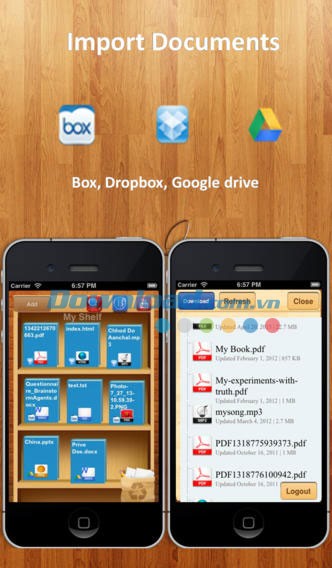Việc sắp xếp tài liệu trong giá sách trở nên dễ dàng hơn bao giờ hết. Người dùng có thể tải tài liệu từ các dịch vụ lưu trữ đám mây phổ biến như Dropbox , Google Drive , hoặc tài khoản Box.net.