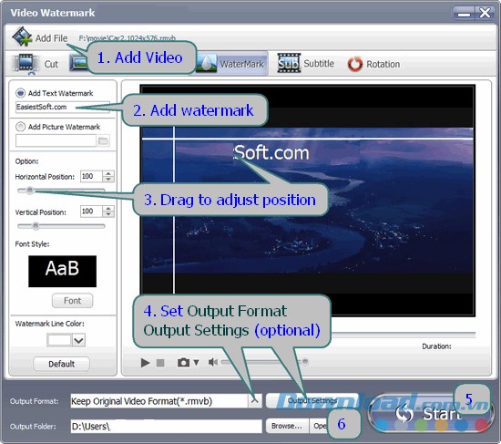 - Bước 5: Bắt đầu quá trình thêm hình mờ bằng cách nhấn nút "Start".