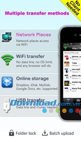 iFileExplorer cung cấp đa dạng các phương thức truyền tải dữ liệu. Người dùng có thể linh hoạt lựa chọn giữa kết nối không dây WiFi, giao thức USB truyền thống, hoặc tận dụng các dịch vụ lưu trữ đám mây phổ biến như Dropbox, iDisk (MobileMe), Google Docs, và myDisk.