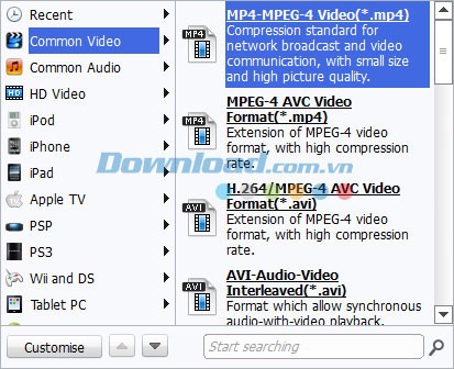 Chọn định dạng bạn muốn từ danh sách thả xuống, bao gồm các định dạng phổ biến như: MP4, MOV, MKV, FLV, AVI, WMV, 3GP, v.v. Các cấu hình cài đặt sẵn cho các thiết bị di động như iPhone, iPad, iPod, Samsung, HTC, PSP, Xbox 360 cũng được cung cấp, giúp bạn chuyển đổi video tương thích với thiết bị của mình. Nhấn Settings để tùy chỉnh các thông số đầu ra.