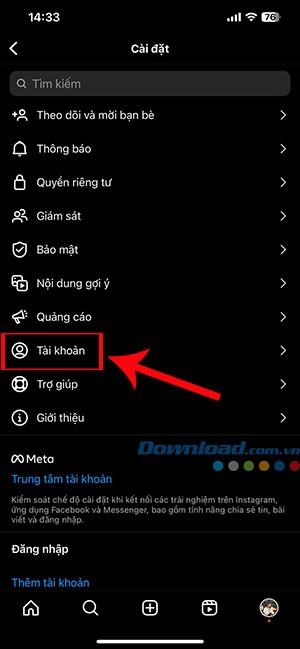 Bước 3: Trong danh sách các tùy chọn Cài đặt, hãy chọn Tài khoản.