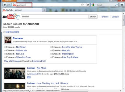 Ví dụ, để tìm kiếm video về Eminem trên YouTube, bạn chỉ cần nhập "y eminem" vào thanh địa chỉ. Kết quả sẽ được hiển thị ngay lập tức.