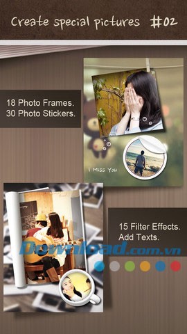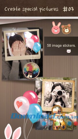 Ứng dụng sở hữu bộ sưu tập 58 hình dán sticker đáng yêu, đa dạng, cho phép người dùng tùy biến ảnh theo sở thích cá nhân.