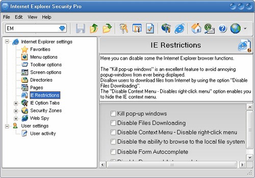 Với Internet Explorer Security Pro, bạn gần như không cần phải can thiệp trực tiếp vào các cài đặt của Internet Explorer mà vẫn có thể kiểm soát hoàn toàn trình duyệt ở mức độ gần 100%.