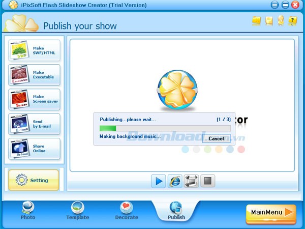 Ngoài ra, iPixSoft Flash Slideshow Creator còn cho phép người dùng xuất ra các định dạng như file SWF, file HTML, screensaver, hoặc trực tiếp tải lên máy chủ để chia sẻ dễ dàng với mọi người.