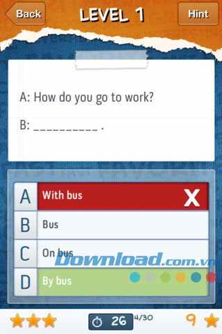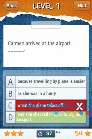 Sau khi chọn cấp độ, hãy bắt đầu trả lời các câu hỏi từ những bài kiểm tra đầu tiên. Trong quá trình làm bài, nếu gặp khó khăn, người dùng có thể tận dụng tính năng gợi ý "Hint" để loại bỏ một số lựa chọn sai.