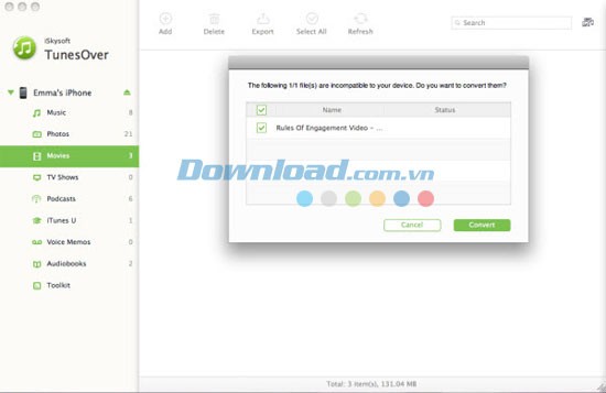 TunesOver có thể chuyển đổi bài hát hoặc video sang định dạng tương thích với iPhone, iPad và iPod touch. Nếu bạn chuyển những tập tin không tương thích, một cửa sổ pop-up sẽ yêu cầu chuyển đổi định dạng file. Nhấn nút “” để bắt đầu chuyển đổi.