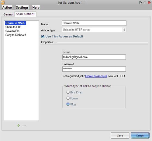 Để chia sẻ ảnh trực tuyến, bạn cần đăng ký một tài khoản miễn phí trên trang chủ của JS. Nhấp chuột phải vào biểu tượng dưới taskbar, chọn Change Settings> Share Options> Share in Web và nhấn vào Create an Account. Trình duyệt sẽ mở ra yêu cầu bạn nhập địa chỉ email và mật khẩu. Hoàn tất biểu mẫu và nhấn Register, sau đó kích hoạt tài khoản qua email.