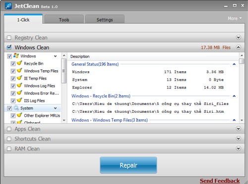 Công cụ này nhanh chóng xác định và xóa bỏ các tập tin rác còn sót lại trong Thùng rác, danh sách tài liệu gần đây, tập tin tạm, clipboard, file log, thông báo lỗi, bộ nhớ và nhiều thành phần khác.