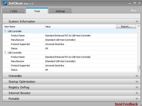- Portable Creator: Tạo bản portable của ứng dụng để sử dụng trên nhiều máy tính. Nhấn nút Browse để chọn đường dẫn, sau đó nhấn Generate. Để sử dụng, giải nén file ZIP và chạy JetClean.exe.