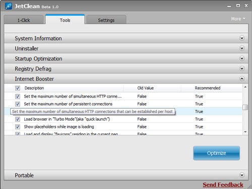 - Internet Optimizer: Cải thiện tốc độ truy cập Internet. Nhấn nút Scan để tìm các thông số cần tối ưu, sau đó nhấn Optimize để thực hiện.